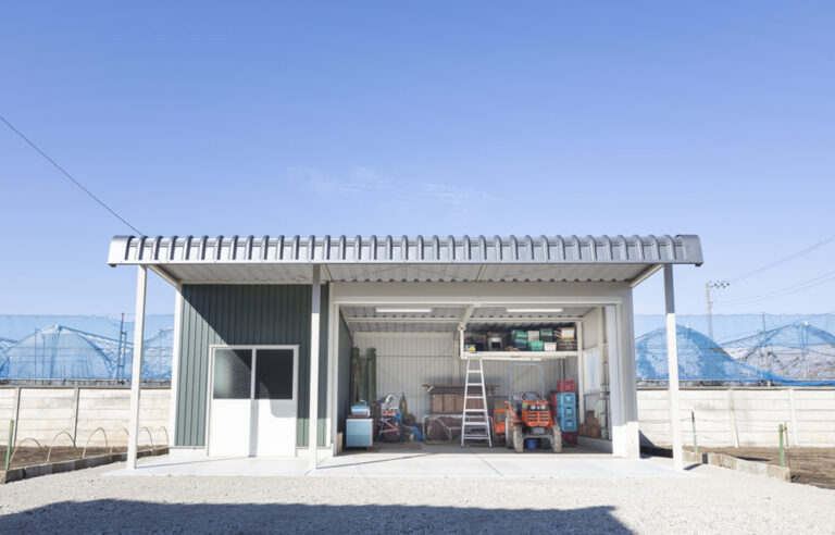 最大200㎡、高さ7mまで規格商品で対応できます。中柱なしの鉄骨造で作業効率が大幅に向上します。大型の建設資材や物流施設としてもご活用いただいております。